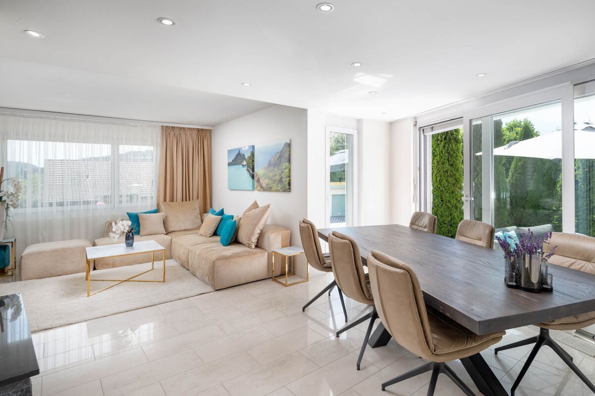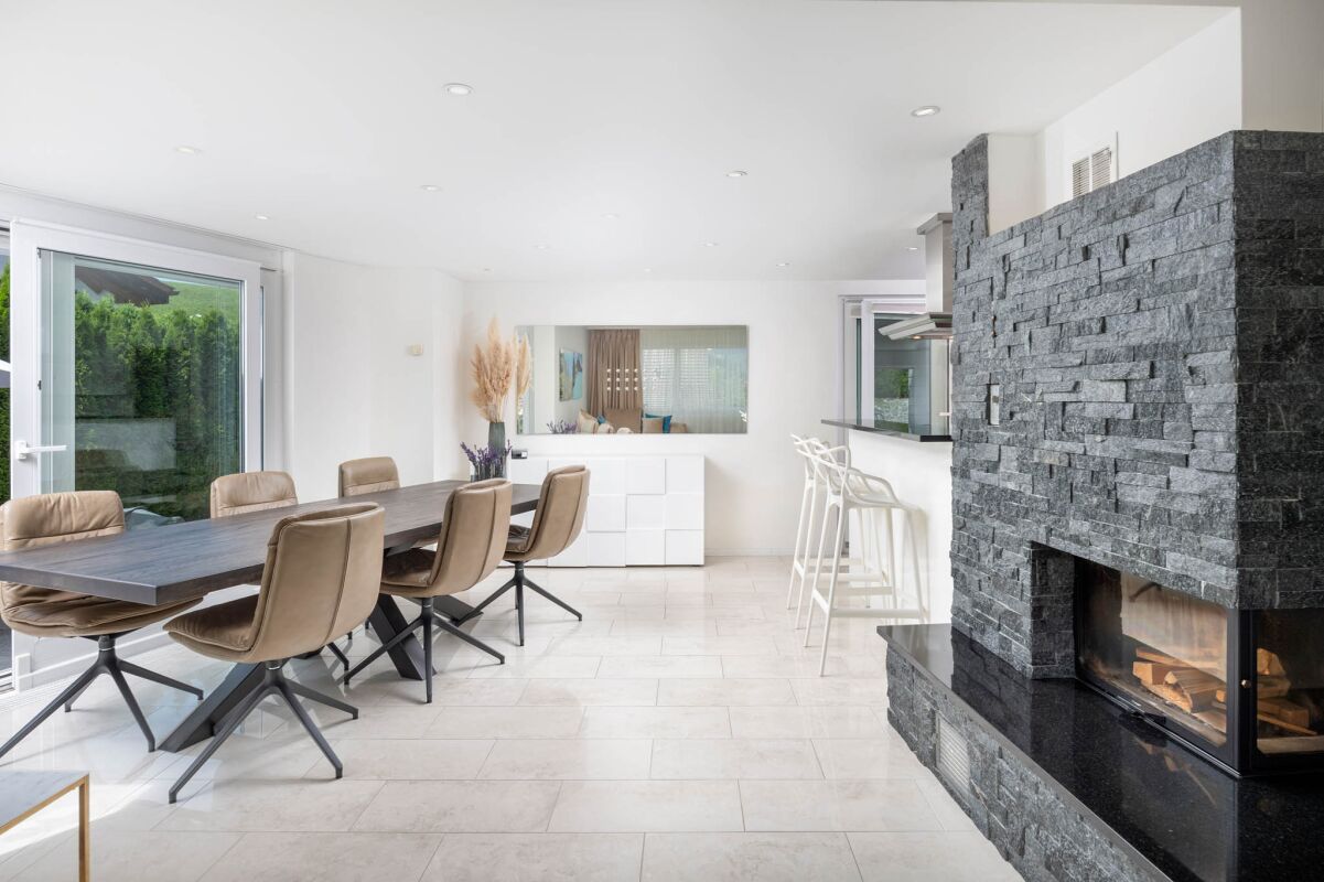 Die spannende Raumaufteilung, die modernen Materialien sowie die Transparenz zur charmanten und sehr grosszügigen Gartenanlage geben dem Objekt eine hohe Wohnqualität und lassen keine Wünsche offen.
