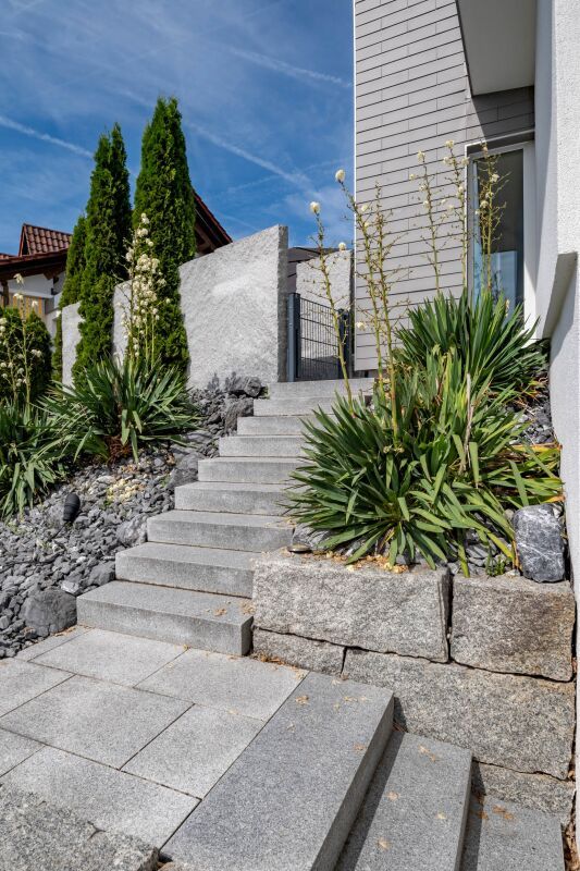Der grosszügige Garten mit schöner Bepflanzung sowie der gedeckte Sitzplatz sind der ideale Ort zum Geniessen und gemütlichen Beisammensein. Der Garten ist für wenig Pflegeaufwand konzipiert.